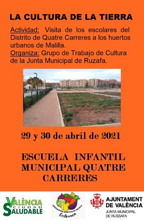 Se trata de realizar, con el alumnado del Distrito de Quatre Carreres, una visita a los huertos urbanos de Malilla, mostrándoles un huerto en funcionamiento.